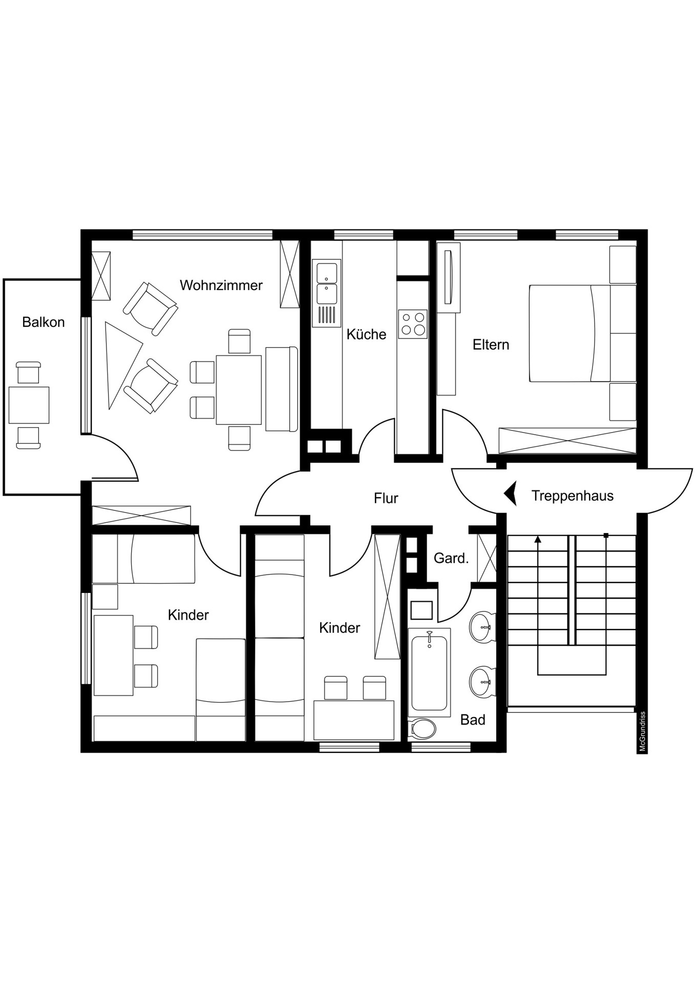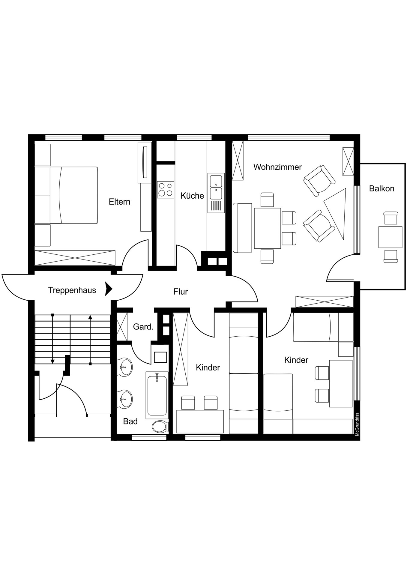 – Wohnung (Mitte links) wurde komplett saniert – Gemeinschaftliche Waschküche – Gartenmitbenutzung für Erdgeschosswohnungen – Drei Garagen aus 2004 – Moderne HeizungsanlageLage