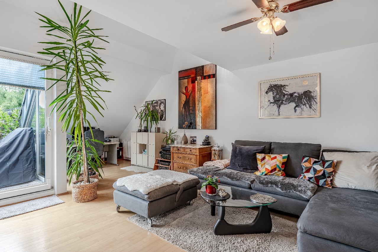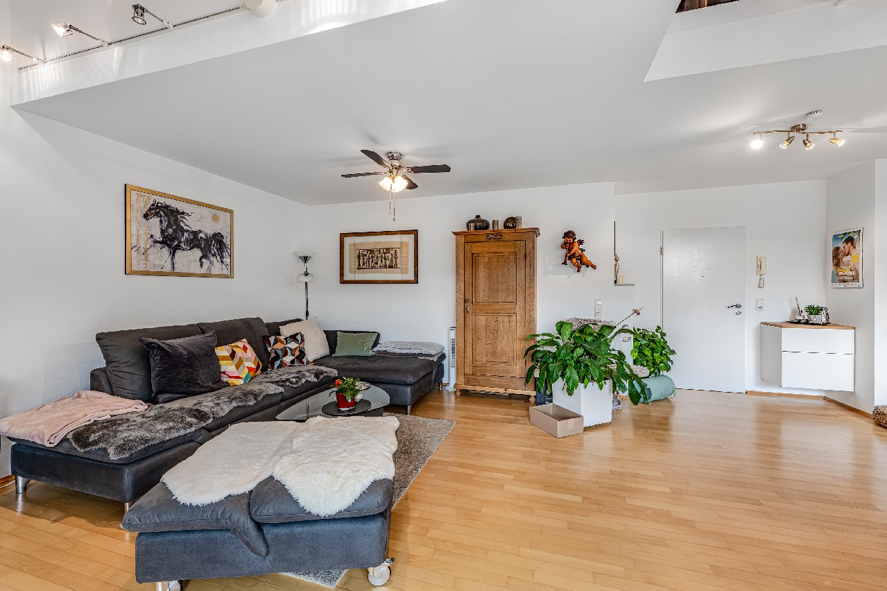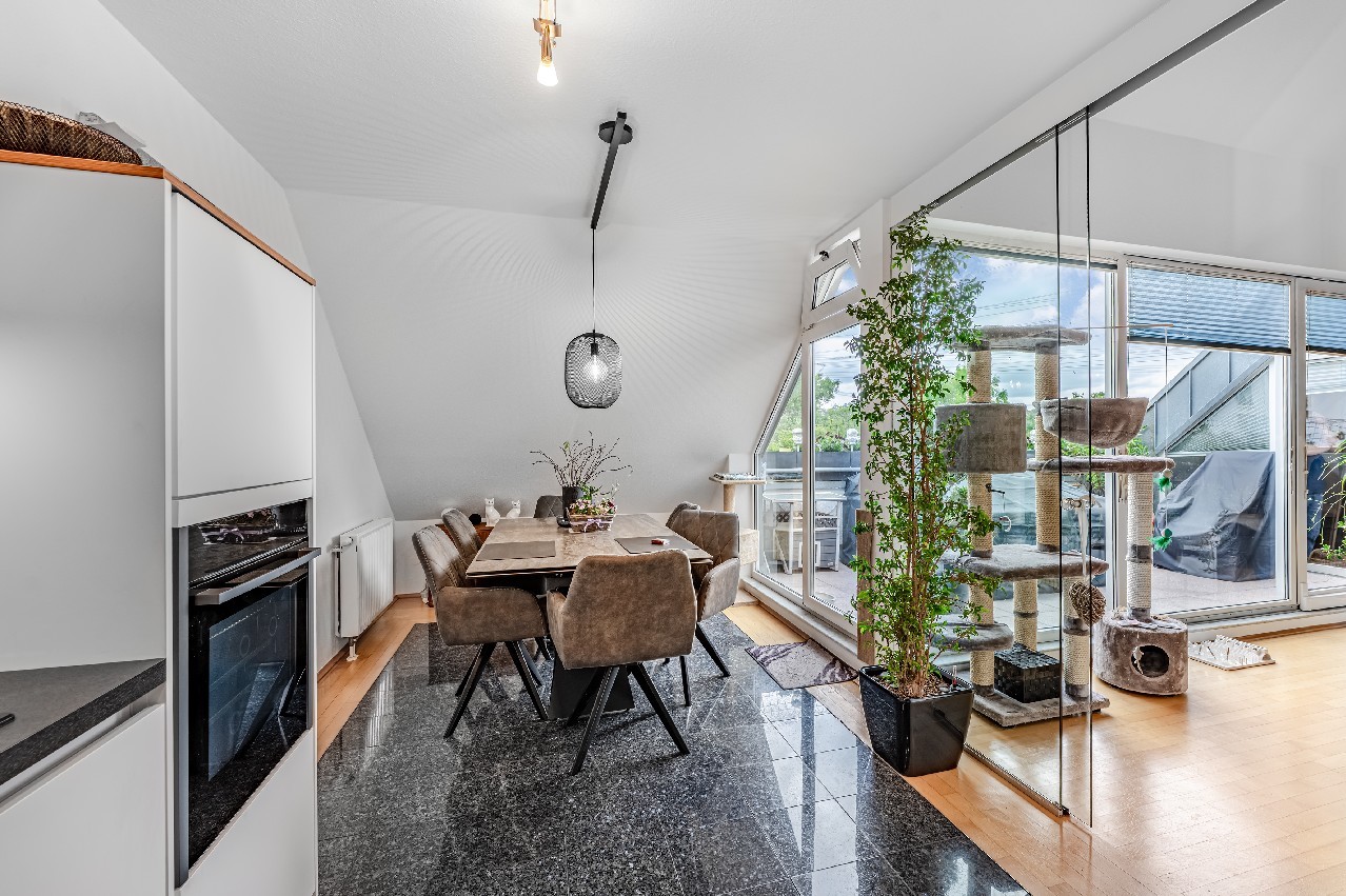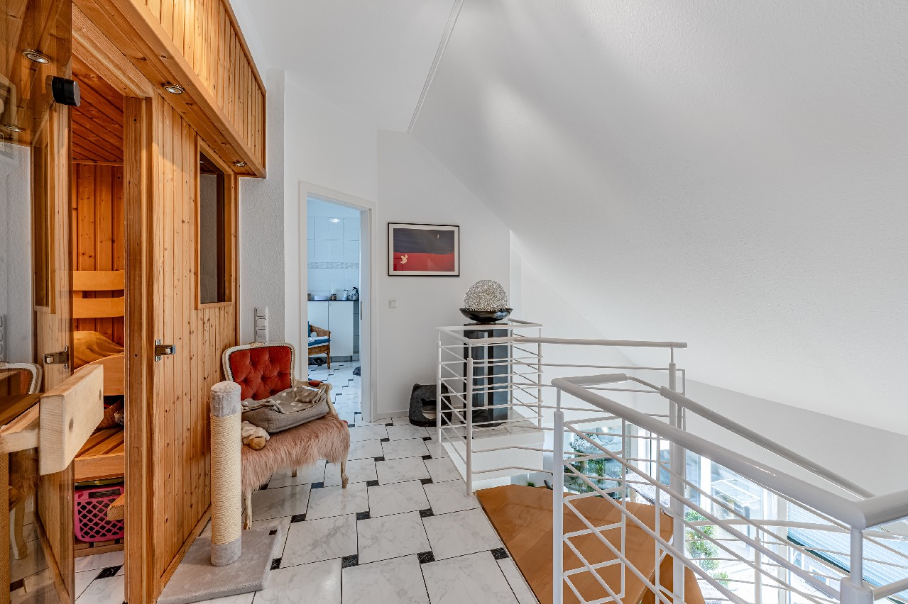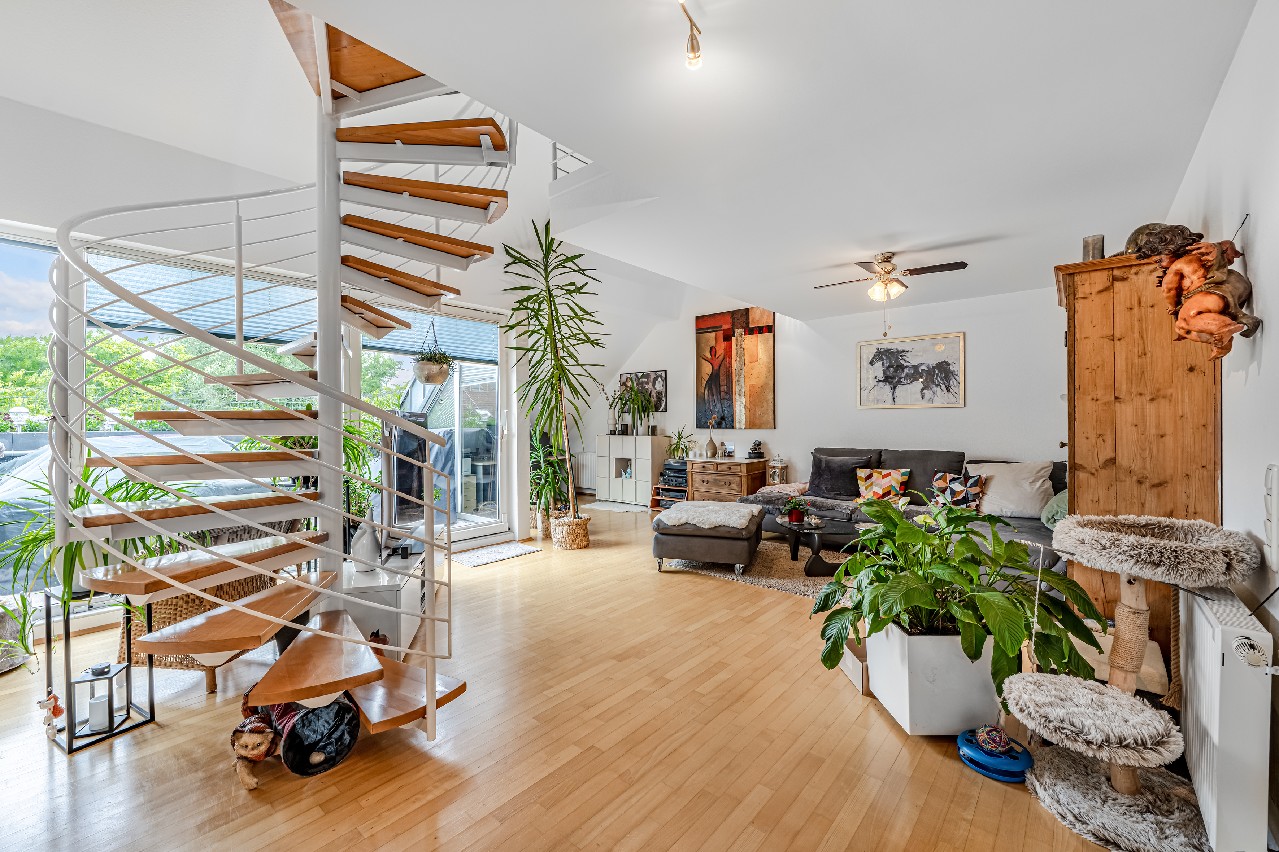 Diese Maisonette-Wohnung erstreckt sich über das 2. Obergeschoss sowie das ausgebaute Galeriegeschoss einer gepflegten Wohnanlage am Rande eines Naturschutzgebiets. Mit einer Wohnfläche von ca. 107 m², zwei Balkonen, einer beeindruckenden Raumhöhe durch die offene Galerie und einer hochwertigen Ausstattung bietet diese Immobilie außergewöhnlichen Wohnkomfort – sowohl für Kapitalanleger als auch für Eigennutzer mit Anspruch. Der Zugang zur Wohnung erfolgt über das 2. Obergeschoss. Hier eröffnet sich ein großzügiger Wohnbereich mit Zugang zum großen Balkon in Westausrichtung. Über ein großes Schiebetürelement gelangen Sie ins Freie. Die Küche und der Essplatz sind durch eine elegante Glasschiebetür vom Wohnraum separiert. Die moderne Einbauküche wurde erst im vergangenen Jahr von den jetzigen Mietern installiert. Bei gewünschter Eigennutzung kann die Küche von den Käufern entgeltlich übernommen werden. Ein innenliegendes Gäste-WC ergänzt das Raumangebot auf der Eingangsebene. Eine filigrane Wendeltreppe führt ins Galeriegeschoss. Hier beeindruckt besonders der offene Galeriebereich mit Blick in das darunterliegende Geschoss – die großzügige Deckenhöhe und der Lichteinfall schaffen ein luftiges, beinahe loftartiges Wohngefühl. Das Galeriegeschoss beherbergt ein geräumiges Elternschlafzimmer mit praktischen Einbauschränken sowie ein Tageslichtbad mit Dusche und Eckbadewanne. Ein weiterer, ursprünglich als Kinder- oder Gästezimmer geplanter Raum wird als private Sauna und Ruhezone genutzt. Ein Rückbau zur Nutzung als Büro oder Kinderzimmer ist auf Wunsch ohne großen Aufwand möglich. Von hier aus gelangen Sie direkt auf den zweiten, uneinsehbaren Balkon mit weitem Blick ins Grüne. Ein Rückzugsort mit echter Wellness-Qualität. Ein kleiner Abstellraum in der Dachschräge komplettiert die Wohneinheit. Die Wohnung ist unbefristet vermietet. Das Mietverhältnis besteht seit über 15 Jahren. Die derzeitigen Mieter fühlen sich ausgesprochen wohl und würden das Mietverhältnis gerne fortsetzen. Die aktuelle Kaltmiete beträgt 11.700 € pro Jahr. Eine Eigenbedarfskündigung ist unter Einhaltung der gesetzlichen Fristen möglich. Fazit: Diese Maisonette-Wohnung ist keine Standardimmobilie – sie ist ein Zuhause mit Charakter, Charme und außergewöhnlicher Raumwirkung. Die durchdachte Grundrissgestaltung, die naturnahe Lage und der gepflegte Zustand machen die Wohnung zu einer idealen Wahl, sei es als wertstabile Kapitalanlage oder als künftiges Refugium für Paare oder kleine Familien.Ausstattung