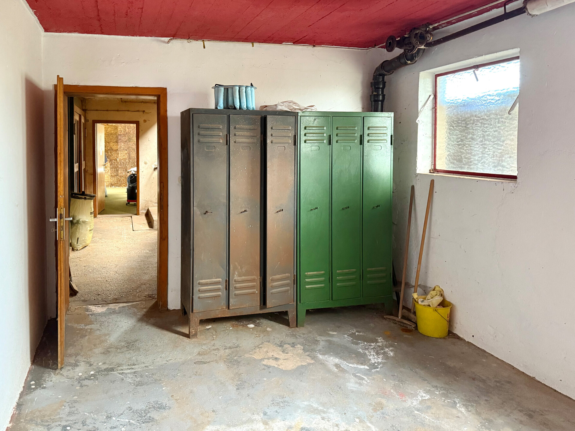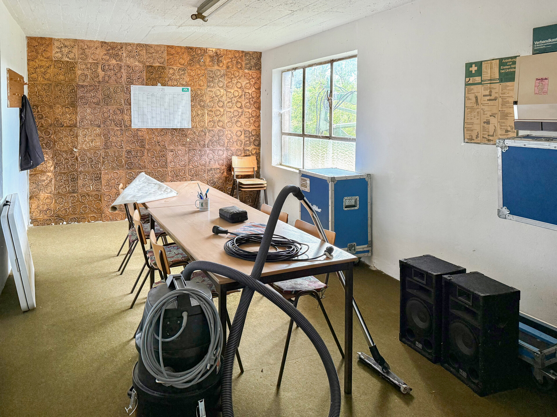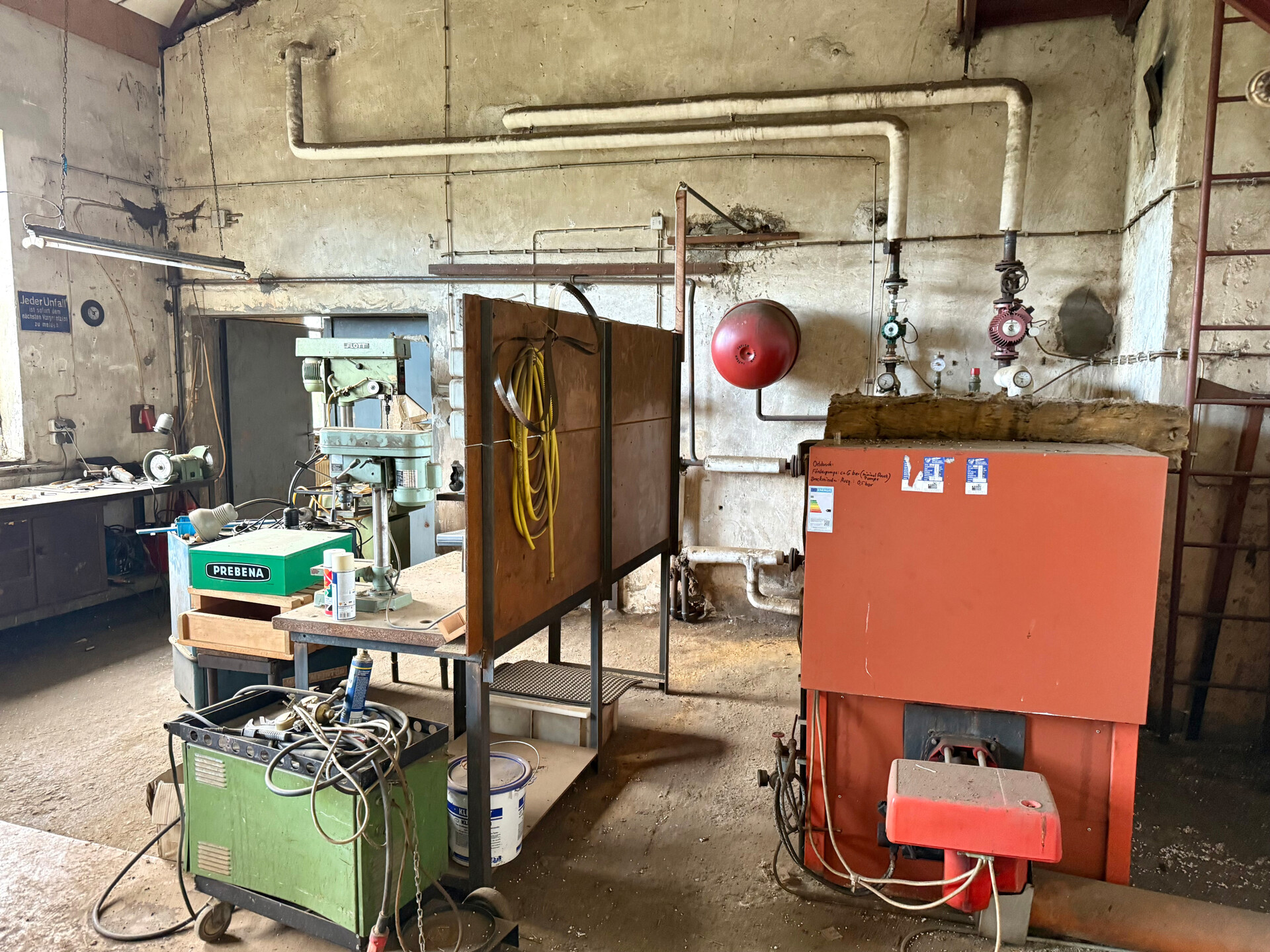 Dach: Dunkelgrünes Trapezblech Decke über Kellergeschoss: Stahlbeton-Decke Beheizung: Öl-Zentralheizung Fenster: Einfachverglasung Böden: Beton, Fliesen, TeppichLage