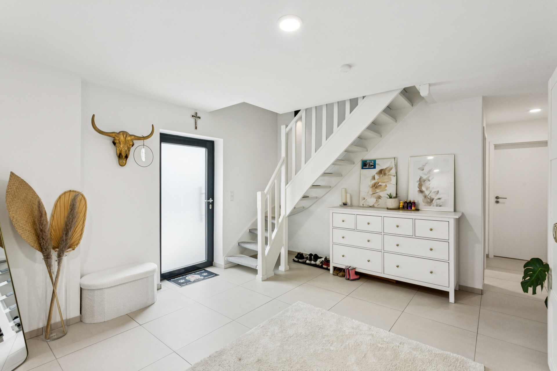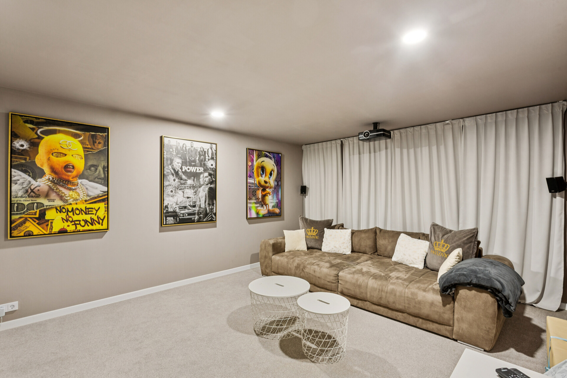 Dieses freistehende Einfamilienhaus vereint zeitgemäßen Wohnkomfort mit einem durchdachten Raumkonzept und einem Ambiente, das zum Wohlfühlen einlädt. Die umfassende und stilvolle Sanierung im Jahr 2022 hat ein Zuhause geschaffen, das sowohl funktional als auch ästhetisch überzeugt. Das ca. 686 m² große Grundstück grenzt direkt an eine Weide und bietet absolute Ruhe sowie ein hohes Maß an Privatsphäre. Drei großzügige Terrassen mit Süd- und Westausrichtung laden zum Entspannen und Genießen ein. Eine rund 120 m² große, gepflasterte Stellfläche bietet reichlich Platz für Fahrzeuge. Ein Starkstromanschluss ist bereits vorhanden und ermöglicht den unkomplizierten Anschluss einer Wallbox. Auf rund 160 m² Wohnfläche erwarten Sie sechs helle, gut geschnittene Zimmer, zwei moderne Bäder sowie ein Gäste-WC mit exklusiver Ausstattung. Das Erdgeschoss empfängt Sie mit einem großzügigen Eingangsbereich, der ausreichend Platz für eine Garderobe bietet. Zudem befinden sich hier ein weiteres Badezimmer mit Dusche, ein Fitnessraum, ein stilvoller Kinoraum sowie ein zusätzlicher Lagerraum – perfekt für Freizeit, Entspannung und praktische Nutzung. Im 1. Obergeschoss überzeugt das Haus mit einem großzügigen Wohn- und Esszimmer, einer angrenzenden, hochwertig ausgestatteten Design-Küche, einer praktischen Waschküche sowie einem Gäste-WC. Im Dachgeschoss erwarten Sie drei gemütliche Schlafzimmer und ein helles Badezimmer mit Dusche und Badewanne – ideal für Familien oder Gäste. Die hochwertige Design-Küche ist mit modernster Premium-Technik ausgestattet, darunter ein Quooker Pro 3 Wasserfiltersystem, das auf Knopfdruck Sprudelwasser, gefiltertes Trinkwasser, kochendes und normales Wasser liefert. Ein besonderes Highlight ist das exklusive Heimkino, das unvergessliche Filmabende garantiert. Im gesamten Haus sorgt eine Fußbodenheizung für angenehme Wärme, während das integrierte Smart-Home-System mit Philips Hue Beleuchtung und elektrischen Jalousien bequem per App steuerbar ist. Dieses Einfamilienhaus bietet ein außergewöhnliches Zusammenspiel aus hochwertiger Ausstattung, großzügigem Platzangebot und einem Wohnambiente, das sofort begeistert – ein Zuhause, das keine Wünsche offenlässt.Ausstattung