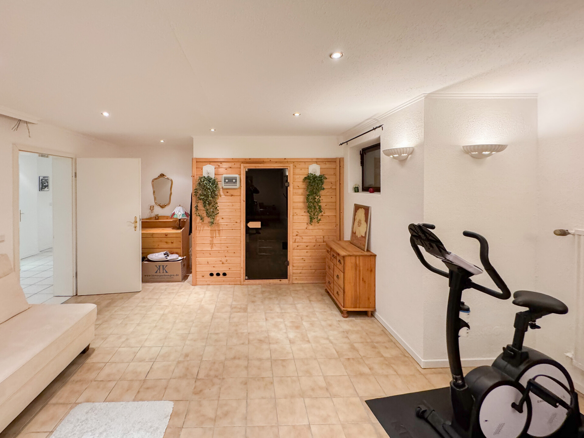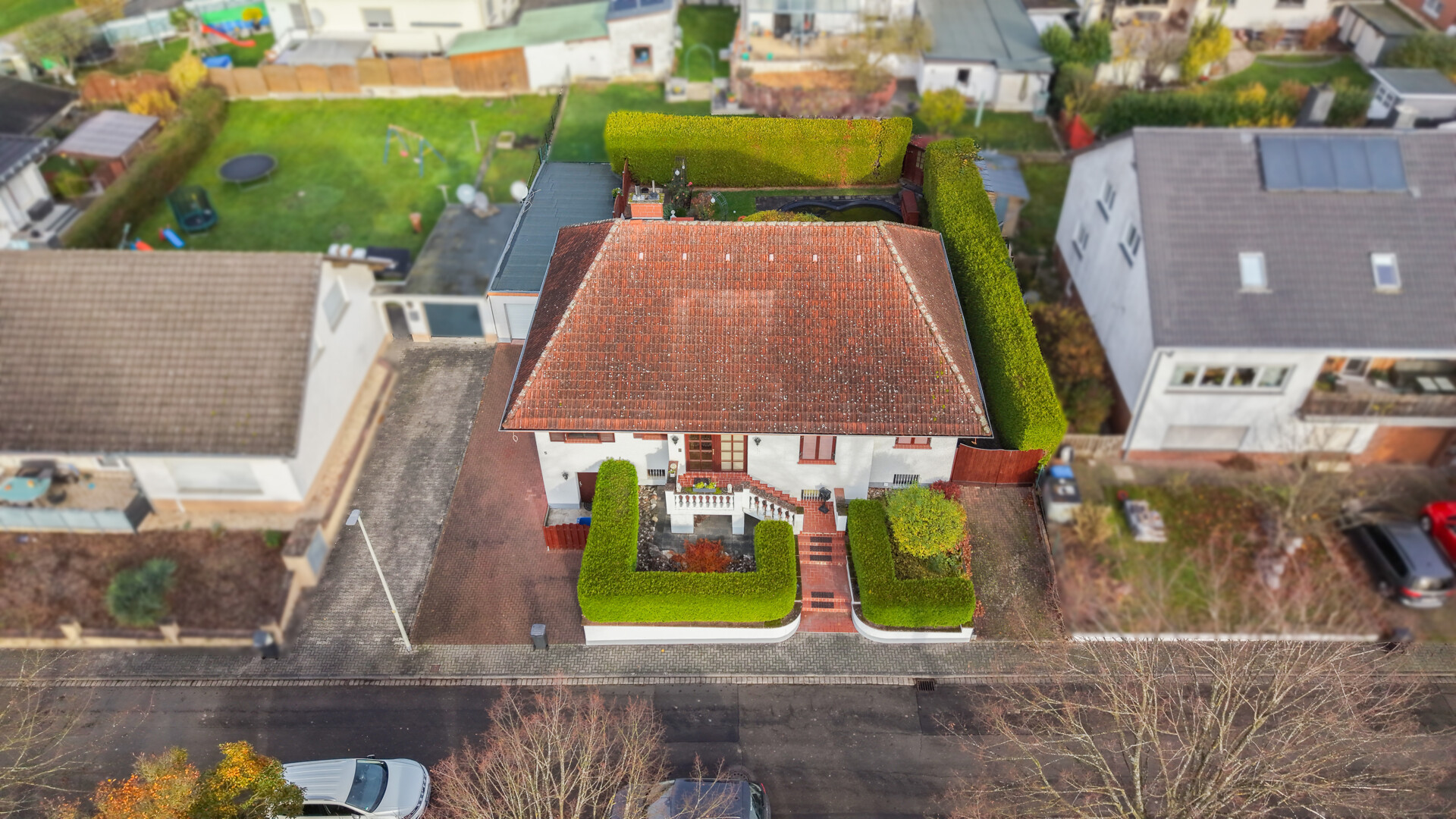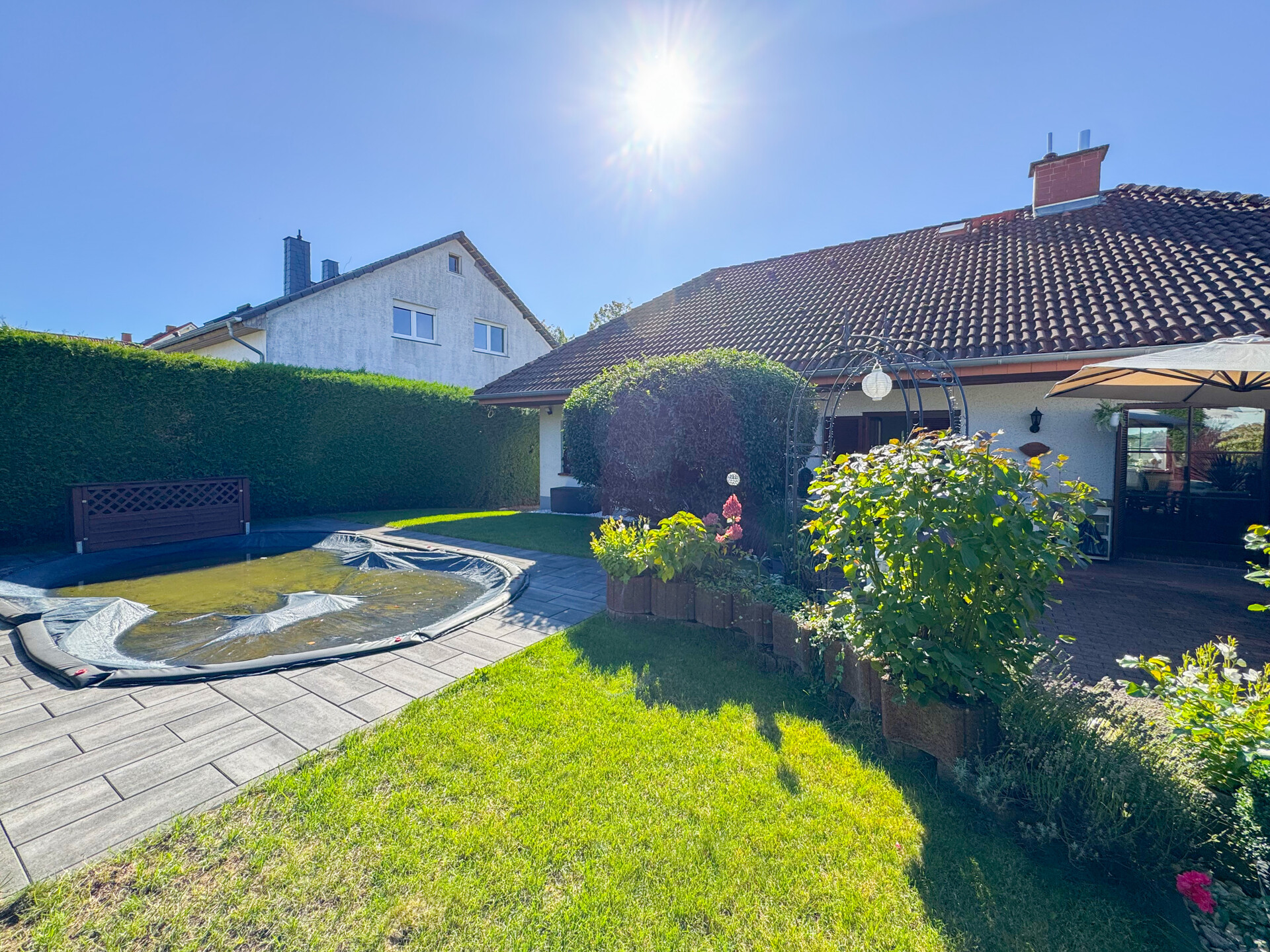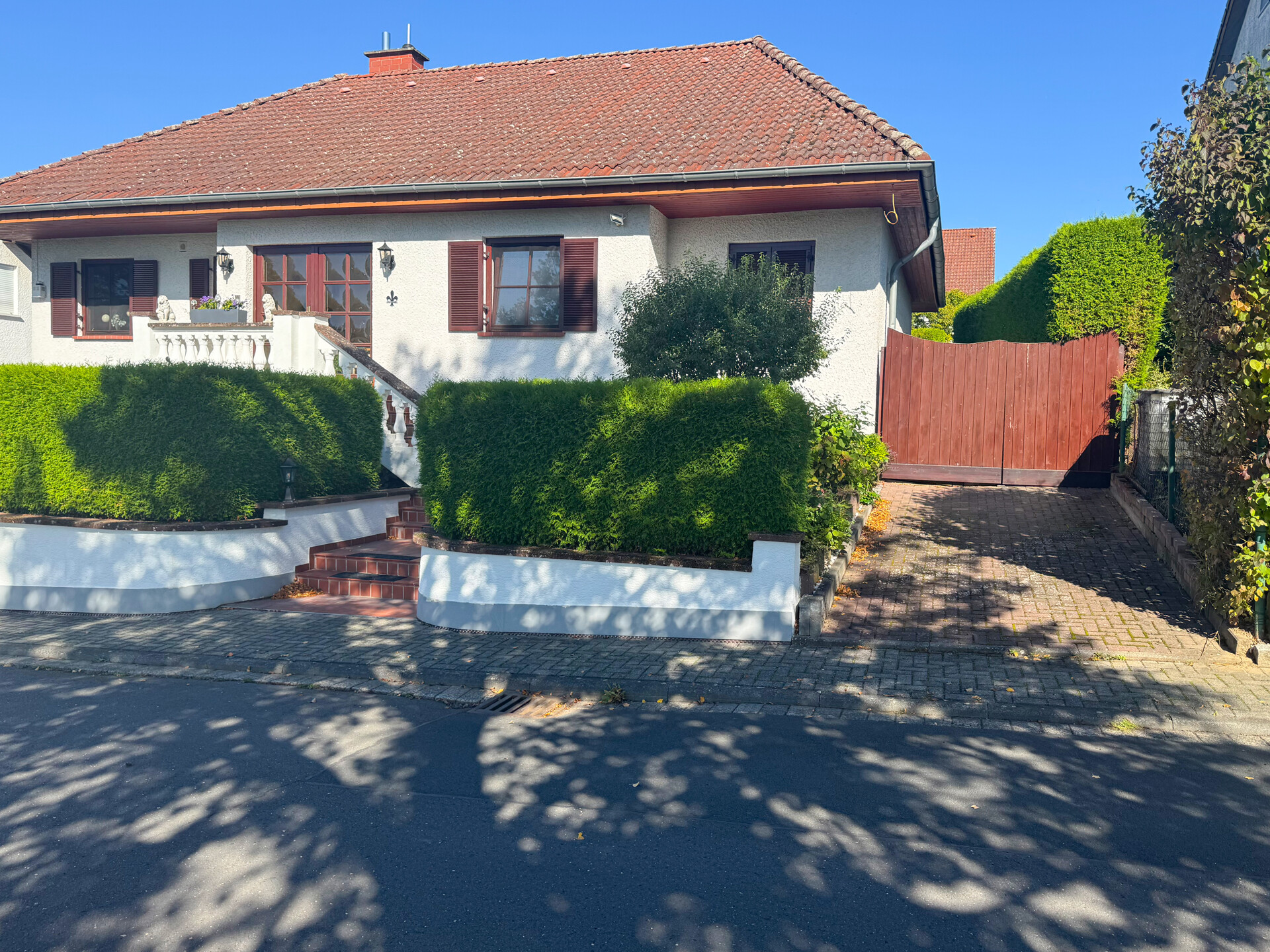 Dieses massive Einfamilienhaus wurde ca. 1990 erbaut und erstreckt sich über eine Etage, wodurch Wohnen auf einer Ebene ermöglicht wird. Die Wohnfläche von ca. 142 m² umfasst ein klimatisiertes Schlafzimmer mit angrenzender Ankleide, ein Büro/Kind, ein Badezimmer sowie Gäste. Der begehbare Kleiderschrank sorgt für Stauraum und Komfort. Die Einbauküche lädt zum Kochen und Verweilen ein. Ergänzend sorgt ein luxuriöser Wellnessbereich mit Sauna und Pool für Entspannung. Im EG befinden sich zudem der Wohnbereich und das Esszimmer mit Zugang zum Garten, sodass Sie nahtlos Innen- und Außenwohnen genießen. Das ca. 592 m² große Grundstück bietet eine tolle Fernsicht. Der gepflegte Garten mit Pool eignet sich hervorragend für gesellige Abende oder ruhige Momente im Freien. Das Haus ist unterkellert und bietet vielseitige Nutzungsmöglichkeiten-neben dem Hobbyraum mit Sauna und Duschbad mit WC stehen zusätzliche Stauraumflächen und Weiteres zur individuellen Nutzung bereit. Das DG bietet zudem Ausbaupotenzial: Raumhöhe und Raumgestaltungsmöglichkeiten ermöglichen eine flexible Erweiterung bei Bedarf, z. B. als zusätzlicher Wohn- oder Arbeitsbereich, Gästezimmer oder Mansardenzugang. Der Hofbereich mit großer Garage sorgt für ausreichend Stellfläche für Ihre PKWs.Ausstattung