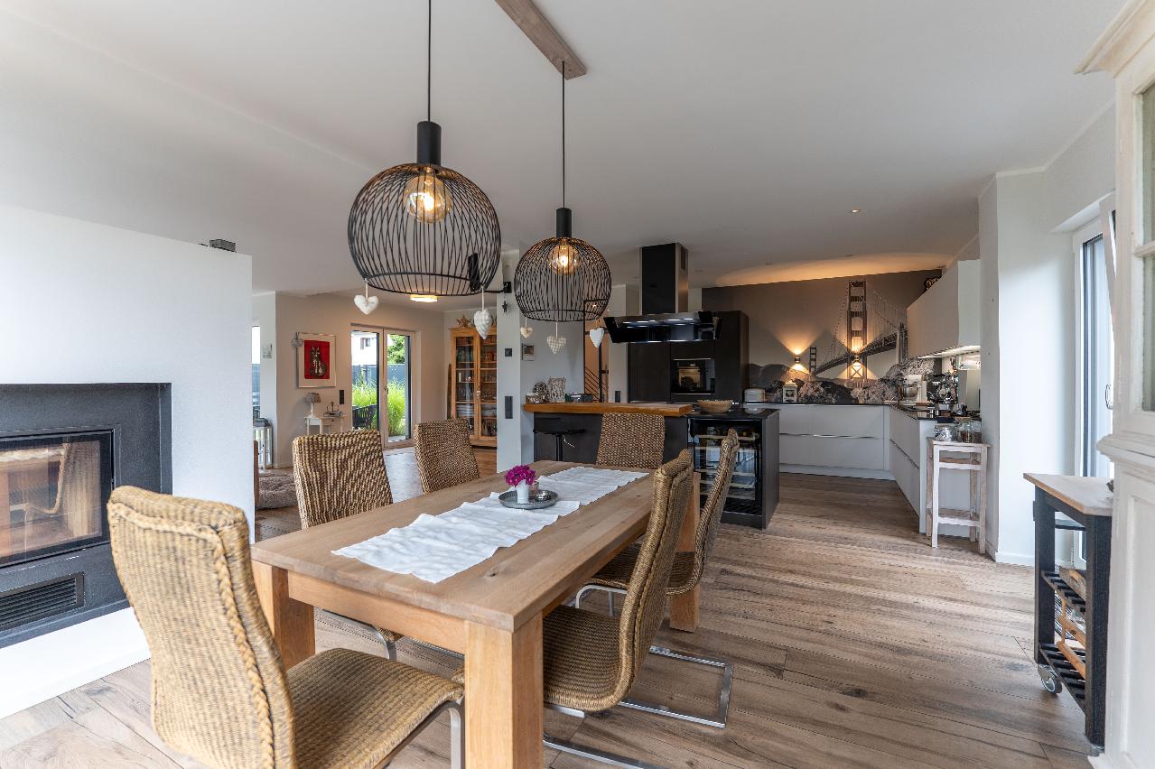 Willkommen in Ihrem neuen Zuhause! Dieses wunderschöne, freistehende Einfamilienhaus besticht durch seine moderne, helle und großzügige Architektur. Mit viel Liebe zum Detail wurde das Haus aufwendig geplant, um höchsten Wohnkomfort zu bieten. Der Eingangsbereich empfängt Sie mit einem separaten Zimmer, das sich ideal für Homeoffice oder Gäste eignet und einem stilvollen Gäste-WC. Das Herzstück des Hauses bildet der offene Wohn- und Essbereich mit einer modernen offenen Küche und Kamin. Große Fenster sorgen für viel Tageslicht und ermöglichen den Zugang zu zwei Terrassen sowie dem gepflegten Garten, der mit einem Gartenhaus zum Entspannen und Verweilen einlädt. Im ersten Obergeschoss befinden sich ein weiteres Büro oder Gästezimmer, ein großzügiges Schlafzimmer mit einem begehbaren Kleiderschrank sowie ein tolles Badezimmer. Das Badezimmer beeindruckt mit einer Dusche und einer Sauna. Zusammen mit einer 30 m² Dachterrasse ist es perfekt für Erholung und Wellness nach einem langen Tag. Im Untergeschoss gibt es eine auch von außen begehbare und helle Einliegerwohnung mit ca. 48 m² Wohnfläche, einem Wohn-/Esszimmer mit offener Küche und einem Duschbad. Der Keller bietet weiterhin ausreichend Stauraum für Vorräte und einen zusätzlichen Speicher für Lagerzwecke. Das Haus verfügt außerdem über eine Doppelgarage mit Wallbox für Ihr Elektroauto sowie einen seitlichen Stellplatz. Mit ca. 249 qm Wohnfläche auf fünf Zimmern bietet dieses Zuhause vielfältige Nutzungsmöglichkeiten. Die offene Raumgestaltung, die hochwertige Ausstattung und die durchdachte Raumaufteilung machen dieses Haus zu einem echten Highlight für Familien, die Wert auf Qualität, Komfort und Liebe zum Detail legen.Ausstattung