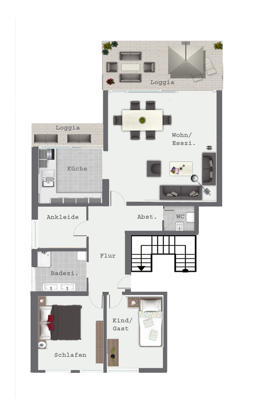 Diese großzügige 4-Zimmer Eigentumswohnung besticht durch ihre hochwertige Ausstattung, durchdachte Raumaufteilung und moderne Gestaltung. Raumaufteilung und Ausstattung: Beim Betreten der Wohnung gelangen Sie zunächst in eine großzügige Diele, die Ihnen Zugang zu allen Wohnräumen bietet. Von hier erreichen Sie drei gut geschnittene Schlafzimmer, das moderne Badezimmer sowie ein großes, lichtdurchflutetes Wohnzimmer. Die gesamte Wohnung ist mit hochwertigen, großformatigen Fliesenböden in moderner Betonoptik ausgestattet und vermittelt ein stilvolles, zeitgemäßes Wohngefühl. Wohn- und Essbereich: Das Herzstück der Wohnung bildet das helle Wohnzimmer mit direktem Zugang zum ersten Balkon. Angrenzend an das Wohnzimmer befindet sich die offen gestaltete, moderne Küche, die nicht nur durch Design und Funktionalität überzeugt, sondern zusätzlich über einen weiteren eigenen Balkon verfügt. Sowohl im Wohnzimmer als auch in der Küche sorgen integrierte Jalousien für angenehmen Sonnenschutz und ein Plus an Privatsphäre. Das neu gestaltete Badezimmer ist mit einer bodentiefen Dusche ausgestattet und hochwertig gefliest. Zusätzlich steht ein separates Gäste-WC zur Verfügung. Aktuell ist die Wohnung gut vermietet.Ausstattung