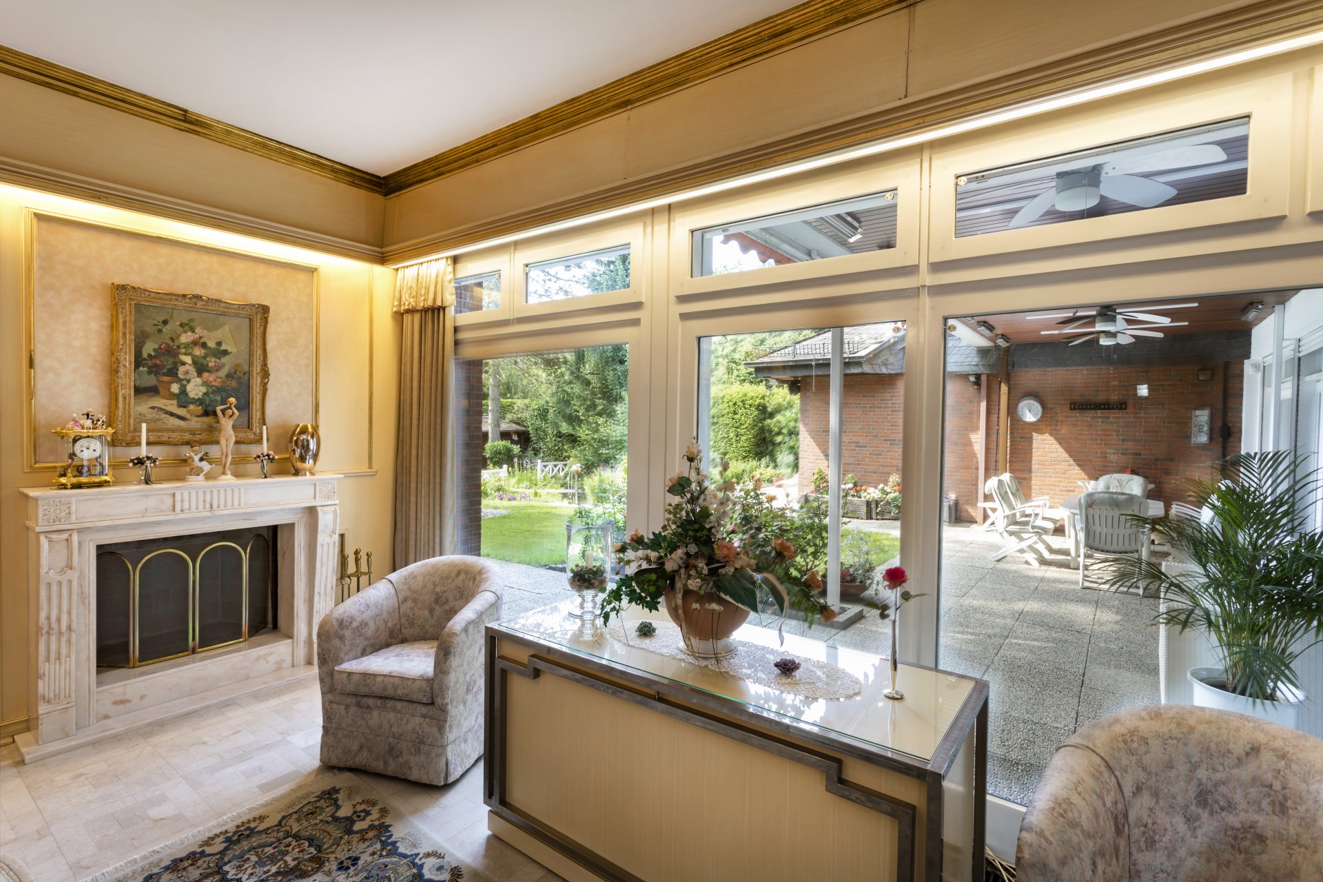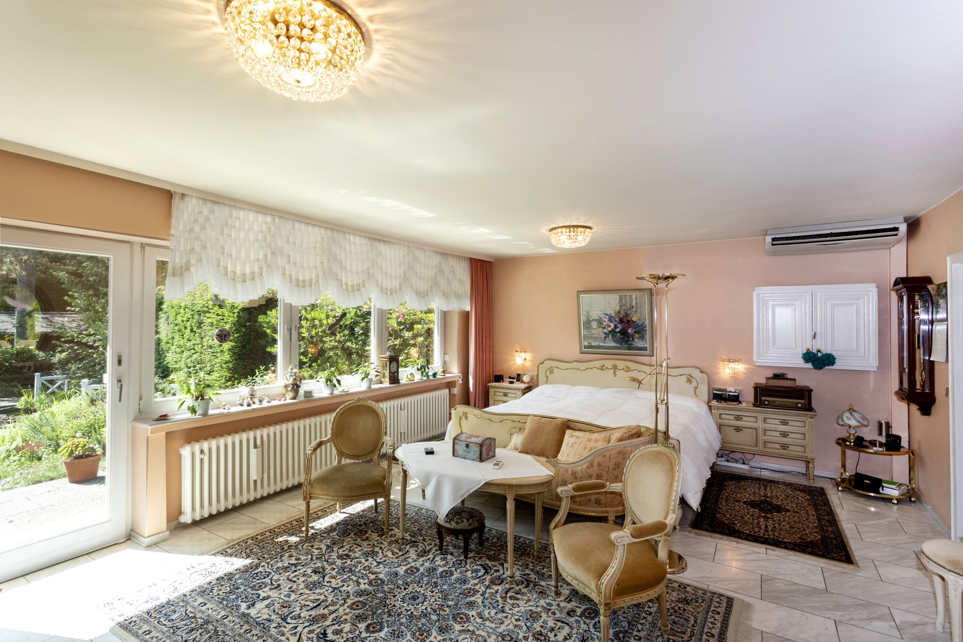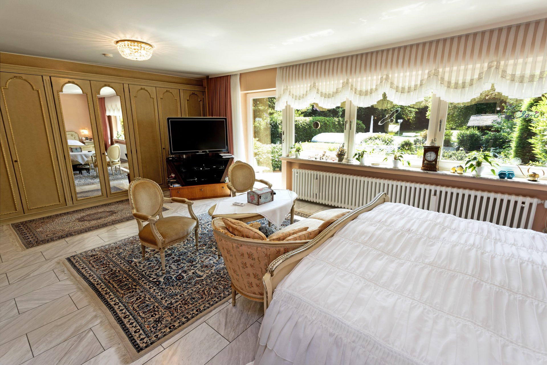Dachform: Walmdach mit Schiefereindeckung, oberste Geschossdecke wärmegedämmt mit Glaswolle Fassade: Klinkerfassade mit ca. 36,5 cm Mauerwerk Geschossdecken: Beton Fenster: Holz mit Zweifachverglasung (Haupthaus 1968/ Anbau 1985) Fenstersicherung: Rollläden, elektrisch bedienbar, Bruchsensoren und Alarmanlage, KG- Fenster tlw. mit Gittern Haustüren: Massive Holztüren mit Mehrfachverrieglung Zimmertüren/ Zargen: Massivholztüren, tlw. hochwertige Kassettentüren sowie im Erdgeschoss im Wohn-/Essbereich doppelflügelige Türen Geschosstreppen: Gewendelte Holztreppe mit Echtholzstufen mit Teppich belegt, Natursteintreppe zum Kellergeschoss, jeweils mit edlem schmiedeeisernen Schmuckgeländer Bodenbeläge: Haupthaus: Eingangsbereich, aktueller Wohn-/ und Essbereich mit hochwertigen Natursteinen, Küche und Bad gefliest, separate Einliegerwohnung: Flur, G-WC, Küche und ein Raum gefliest, zwei weitere Zimmer durchgehend Marmor; Dachgeschoss: Bäder gefliest, ansonsten Eichenparkett. Sanitärbereiche: Haupthaus Erdgeschoss: Gäste-WC mit Fenster sowie Tageslichtbad mit Whirlpool- Badewanne und Dusche/ Dachgeschoss Tageslichtbad mit Dusche und Whirlpoolwanne, weiteres Tageslichtbad mit Dusche/ separate Einliegerwohnung: Gäste-WC und innenliegendes Wannenbad, Kellergeschoss: Weitere Dusche und separater Whirlpool sowie Gäste-WC Terrasse/ Balkon: Erdgeschoss: Teilüberdachte Terrasse mit zwei elektrisch bedienbaren Markisen sowie Heizstrahlern. Zudem überdachter Freisitz mit Außenkamin/ Dachgeschoss: Ca. 21 m² große Loggia mit zwei elektrisch bedienbaren Markisen, jeweils mit Süd- Ostausrichtung und Blick in den Garten Elektroinstallation: Modern mit Kippsicherungen und FI- Schutzschaltern, Alarmanlage vorhanden Heizungsart: Zwei Ölheizung mit zentraler Warmwasseraufbereitung, Baujahr 1985/88, 13.400 l Öltank im KG Warmwasser: Über die Heizungsanlage Garage /Stellplatz: Massiv erbaute Doppelgarage ohne Zwischenwand mit elektrisch bedienbarem Schwingtor, zwei Stellplätze vor der Garage auf dem Grundstück möglich, weitere Parkmöglichkeit im KG. Zudem könnte auf dem Grundstückmein großer Parkplatz realisiert werden. Außenanlagen: Eingezäunter Hauszugang mit Vorgarten, seitliche Zufahrt zu den derzeitigen Stallungen im KG und als Durchfahrt zum Garten. Rückseitiges ca. 2.800 m² großes durch Hecke und Zaun eingefriedetes Grundstück mit großen Rasenflächen, Teichanlage, Gartenhaus, Springbrunnen und beheizter Außenpool mit aufschiebbarem Dach Grundstück: 3.814 m² großes Kaufgrundstück mit Süd- Ostausrichtung, angrenzend an den Fleyerwald Extras: Sauna, offener Kamin im Wohnbereich sowie in der ca. 34 m² großen Kellerbar, zusätzlich überdachter Freisitz mit Außenkamin, Pferdestallung im KG mit 4 Boxen sowohl mit Außen-/ als auch direktem Hauszugang, Klimaanlagen in allen Haupträumen u.v.mLage