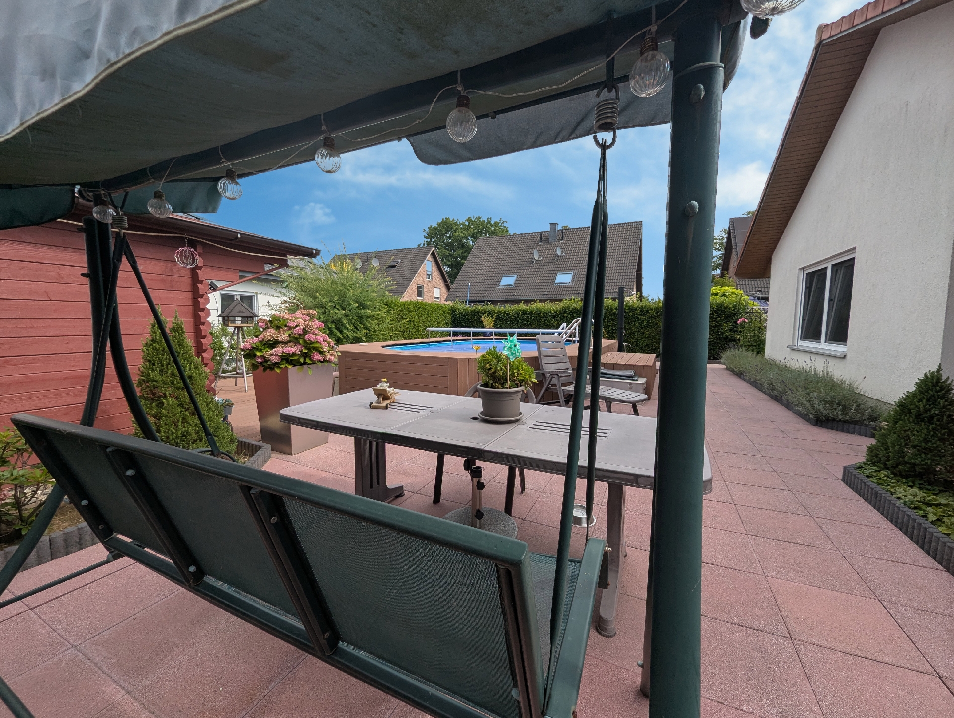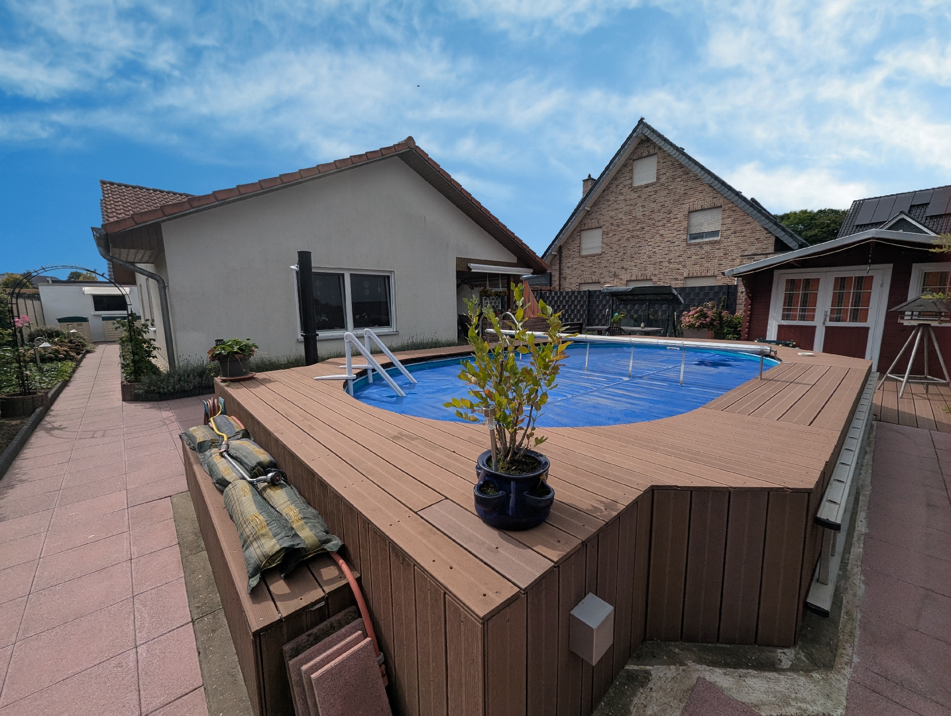 Dieser charmante Bungalow aus dem Jahr 2005 bietet auf einem komplett eingefriedeten Grundstück ein hohes Maß an Privatsphäre und Komfort. Das Haus überzeugt durch seine durchdachte Raumaufteilung, hochwertige Ausstattung und ein attraktives Außenareal, das zum Entspannen und Genießen einlädt. Bereits beim Betreten fällt die großzügige Gestaltung des Wohn- und Essbereichs ins Auge das Herzstück des Hauses. Der offene Schnitt sorgt für eine einladende Atmosphäre und bietet viel Platz für geselliges Beisammensein oder gemütliche Stunden mit der Familie. Angrenzend befindet sich die helle Wohnküche, die ausreichend Raum für einen Esstisch bietet und durch ihre praktische Anordnung besticht. Der Bungalow verfügt über insgesamt zwei Schlafzimmer, die sich individuell als Kinderzimmer, Büro oder Gästezimmer nutzen lassen. Ein modernes Badezimmer mit ebenerdiger Dusche sowie ein zusätzliches Gäste-WC unterstreichen den funktionalen Komfort des Hauses. Zudem steht ein praktischer Hauswirtschaftsraum zur Verfügung, der ausreichend Platz für Waschmaschine, Trockner und Stauraum bietet. Zusätzlicher Stauraum befindet sich im Spitzboden. Auch im Außenbereich bleiben keine Wünsche offen. Das Grundstück ist vollständig umzäunt und bietet damit Sicherheit und Rückzugsmöglichkeiten. Der große Pool mit angrenzender Außendusche sorgt in den Sommermonaten für Urlaubsfeeling direkt vor der Haustür. Eine gemütliche Gartenhütte ergänzt das Angebot und bietet zusätzlichen Stauraum für Gartengeräte oder Freizeitbedarf. Die überdachte Terrasse mit Windschutz lädt zu entspannten Stunden im Freien ein ob beim Frühstück im Sonnenschein oder bei geselligen Grillabenden. Abgerundet wird das Angebot durch eine Garage. Dieser Bungalow vereint modernen Wohnkomfort mit großzügigen Freiflächen und einem durchdachten Grundriss. Die Immobilie eignet sich ideal für Paare oder kleine Familien, die Wert auf ein gepflegtes Zuhause mit besonderem Freizeitwert legen. Vereinbaren Sie noch heute einen Besichtigungstermin.Ausstattung