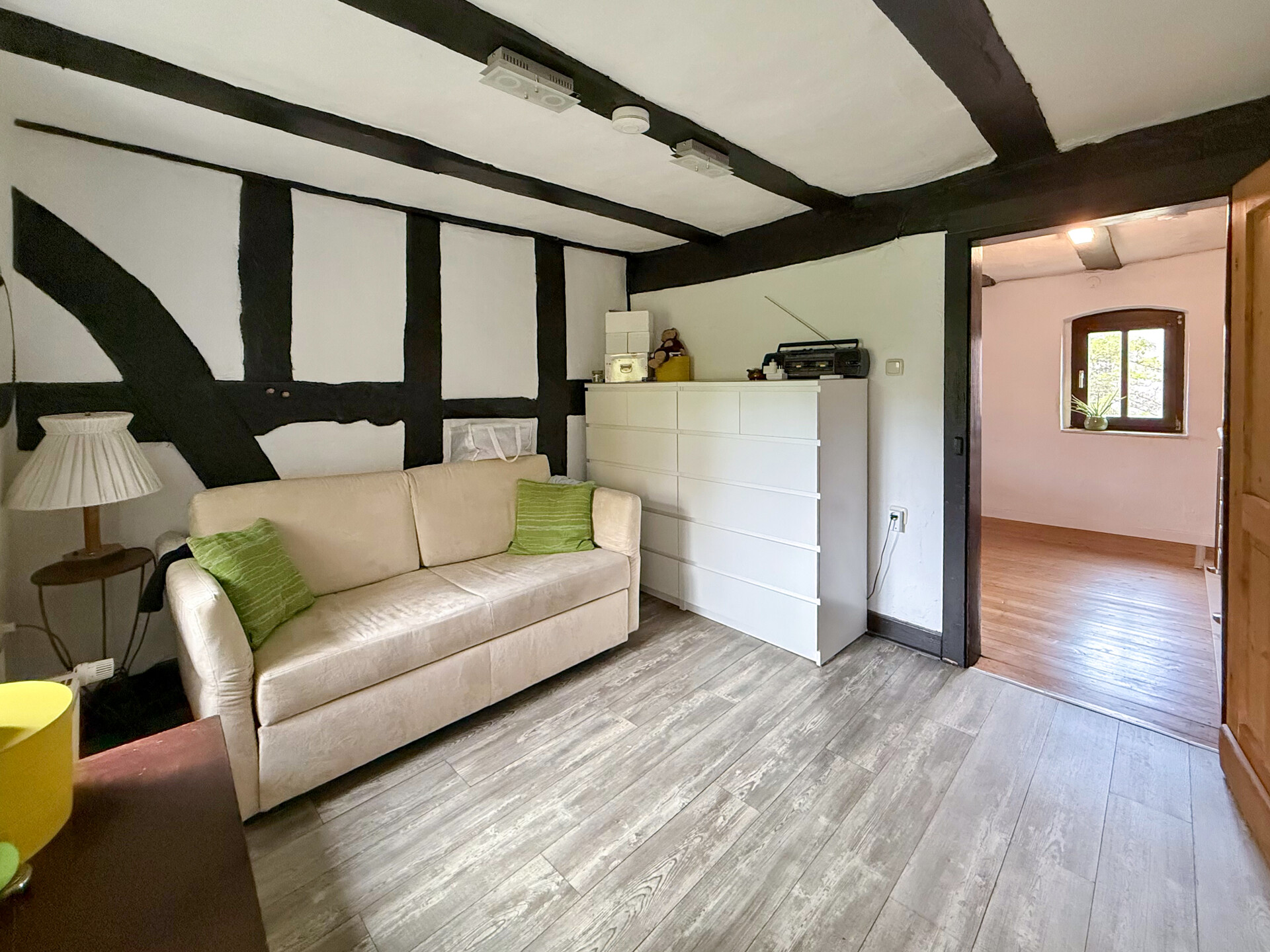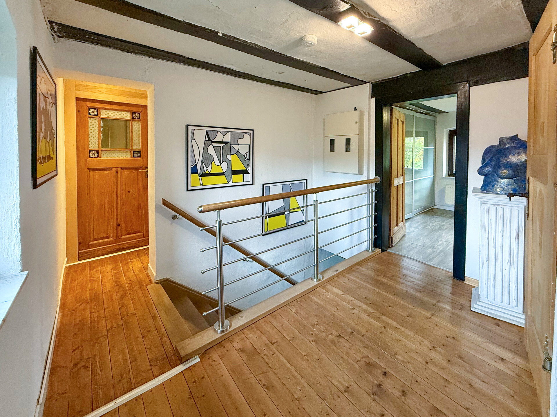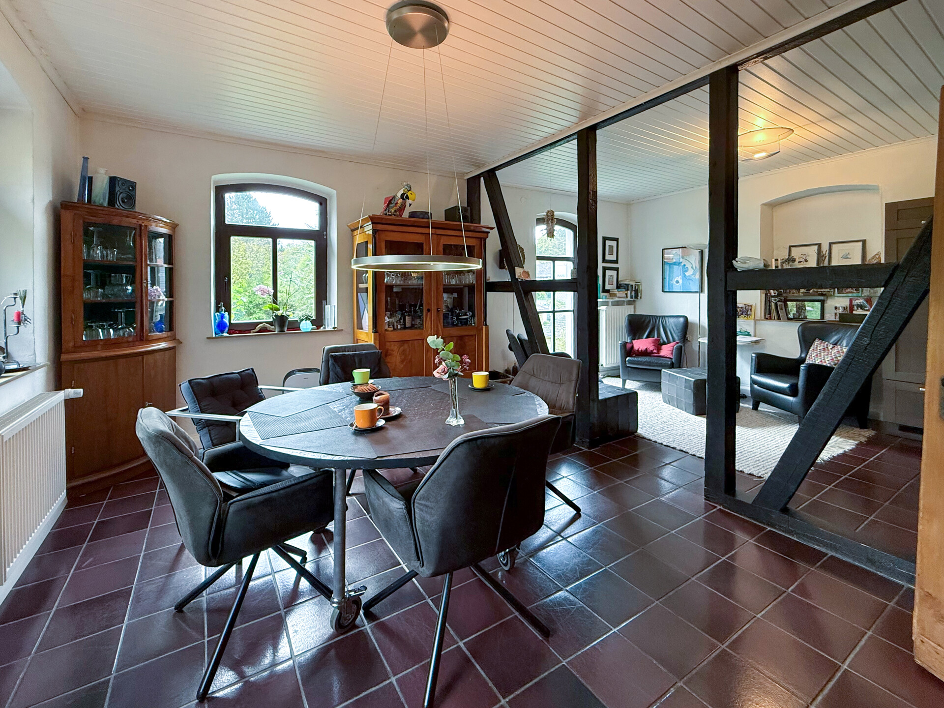Dieses liebevoll modernisierte, ehemalige Fachwerkhaus mit Ursprung um 1800 vereint historischen Charme mit modernstem Wohnkomfort. Auf einem Grundstück von rd. 1.403 m² präsentiert sich das Anwesen – nach stetigen Sanierungen und Renovierungen von 1981 bis heute – in einem sehr guten Zustand! Im Erdgeschoss ist das Wohnen nahezu altersgerecht möglich: Neben dem gemütlichen Wohn-/Essbereich stehen eine hochwertig ausgestattete Küche, ein Wannenbad sowie ein Schlafzimmer oder Büro zur Verfügung. Im ersten Obergeschoss erwarten Sie ein eindrucksvolles Schlafzimmer mit Galerie, ein Kinderzimmer oder eine Ankleide, ein sep. WC sowie ein Wellness-/Saunaraum – perfekt für entspannte Stunden. Ein weiteres Zimmer befindet sich im Dachgeschoss. Insgesamt verfügt das Haupthaus über rd. 174 m² Wohnfläche. Ergänzt wird das Angebot durch vielfältige Nebennutzungen: Im Erdgeschoss der Scheune befinden sich Werkstatt, Heizung/Waschküche und ein Nebenraum, im Obergeschoss ein großzügiger Hobbyraum. Drei Kellerräume bieten zusätzlichen Stauraum. Zum Anwesen gehören außerdem ein Doppelcarport mit Wallbox und Abstellraum, ein Pavillon sowie das wunderschön angelegte Gartengrundstück – ein echtes Refugium, für alle, die Qualität und Gemütlichkeit schätzen!Ausstattung