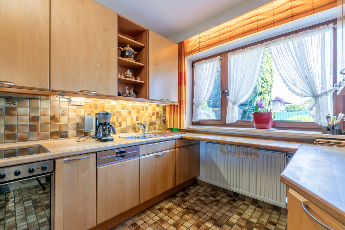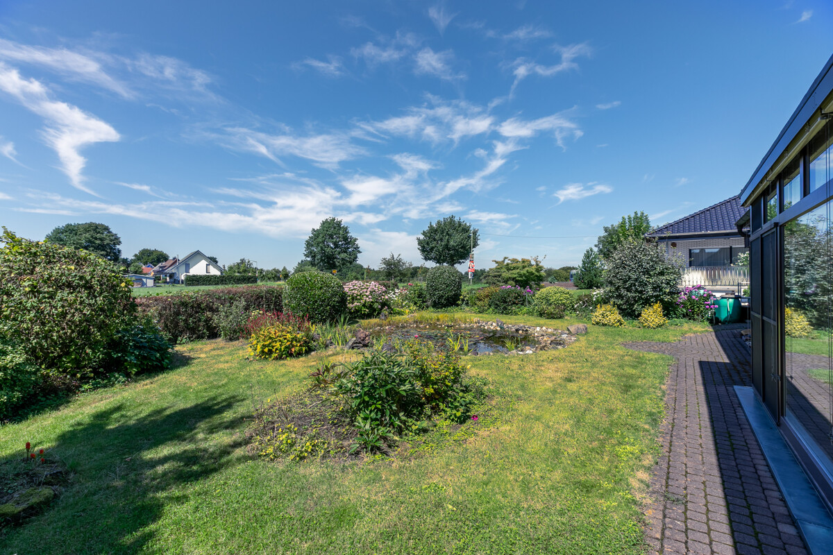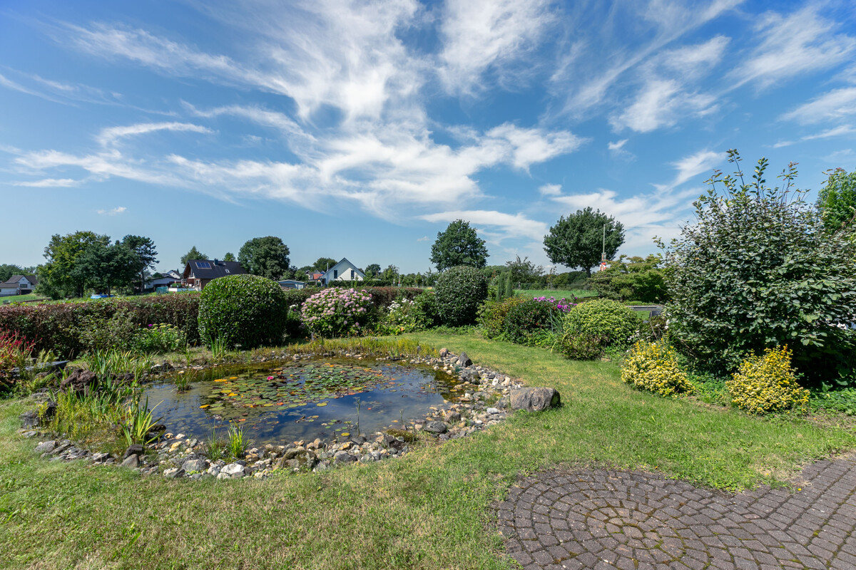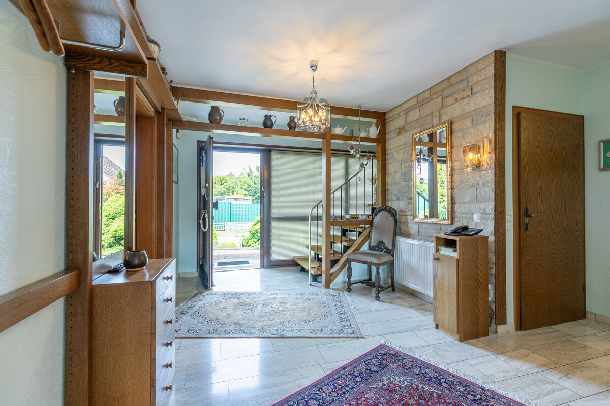 – Gas-Zentralheizung (Bj.1994) – Photovoltaikanlage – Solarthermie für Warmwasseraufbereitung – Weiterer Dachausbau möglich – Einbauküche im KP enthalten – Offener Kamin – Fliesen | Stein | Parkett | Teppichboden – braune Holzfenster mit teilweisen elektrischen Rollläden – braune Holztüren – Wintergarten – hübscher Garten mit Gartenteich – Vollbad | Duschbad mit Sauna – Hobbyraum | Waschküche | Vorratsraum | Kellerraum – Großer Carport | Stellplatz Ein absoluter Traum ist der wunderschön angelegte Garten, der sich mit Worten kaum beschreiben lässt! Mit viel Liebe und Geschmack wurde hier etwas ganz Besonderes geschaffen: Eine Vielzahl von Bäumen, Sträuchern und Blumen sowie ein hübscher Teich laden geradezu zum Verweilen ein. Ob Sonnenbaden, Grillen oder einfach nur Entspannen, hier werden Sie sicher mehr als nur ein Lieblingsplätzchen finden! Bitte sehen Sie sich die 360°-Tour unter https://tour.ogulo.com/vfYm an, bevor Sie mit uns einen Besichtigungstermin vereinbaren!Lage