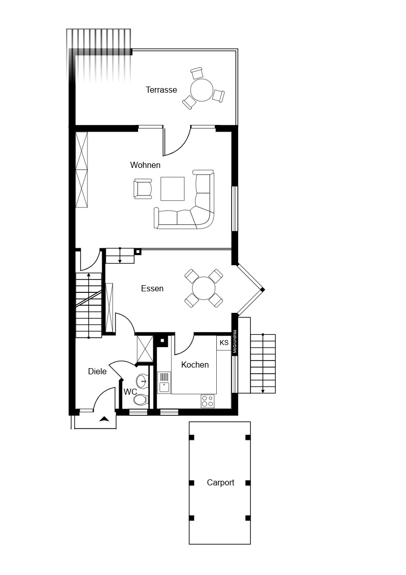 – Terrasse – elektrische Rollläden – Wohngefühl wie in einem Haus – bodentiefe Fenster – Tageslichtfenster im Badezimmer – Gäste-WC – SaunaLage