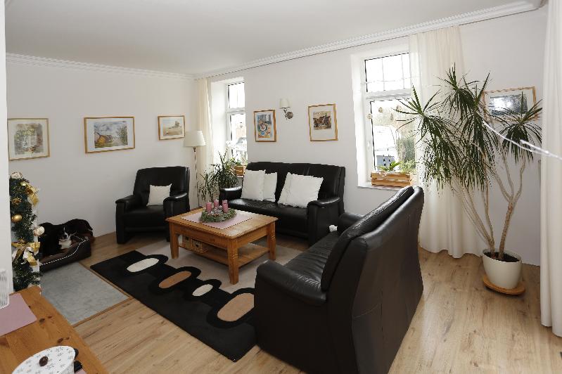 Die Wohnung befindet sich im Obergeschoss des Hauses und erstreckt sich über zwei Etagen. In der unteren Etage befindet sich das gut geschnittene Wohn- und Esszimmer mit separater Küche, ein Gäste-WC sowie ein Schlaf- und Arbeitsraum. Über ein wohnungsinternes Treppenhaus mit wunderschöner Holztreppe gelangt man in die obere Etage mit drei gemütlichen Schlafzimmern, in denen teilweise alte Holzbalken offen liegen und für wohlige Gemütlichkeit sorgen. Das geräumige moderne Bad ist wandhoch weiß gefliest, hat weiße Sanitärobjekte, verfügt sowohl über eine Dusche als auch eine Badewanne und zwei einzelne Waschbecken. Zusätzlich gibt es ein separates Gäste-WC.